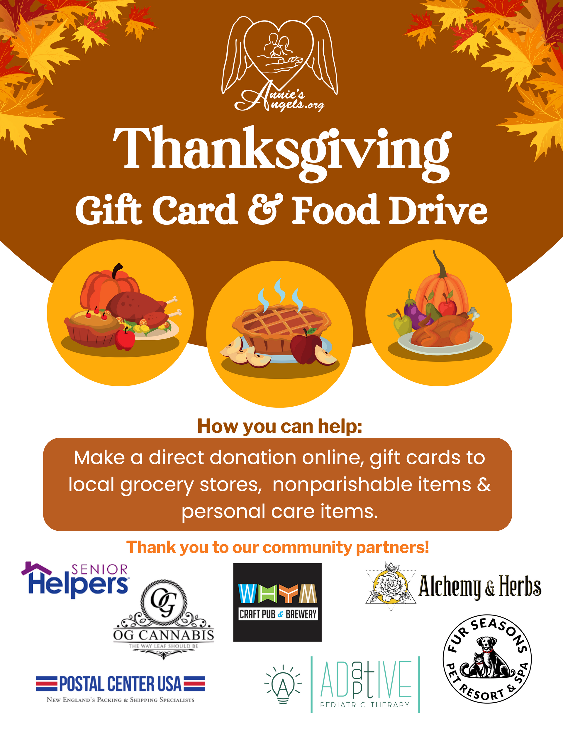 The season of gratitude is here, and YOUR generosity can make a real difference. This year, we are collecting gift cards + non-perishable food items to help our Annie’s Angels families experience a Thanksgiving filled with warmth, dignity, and togetherness. 🤍